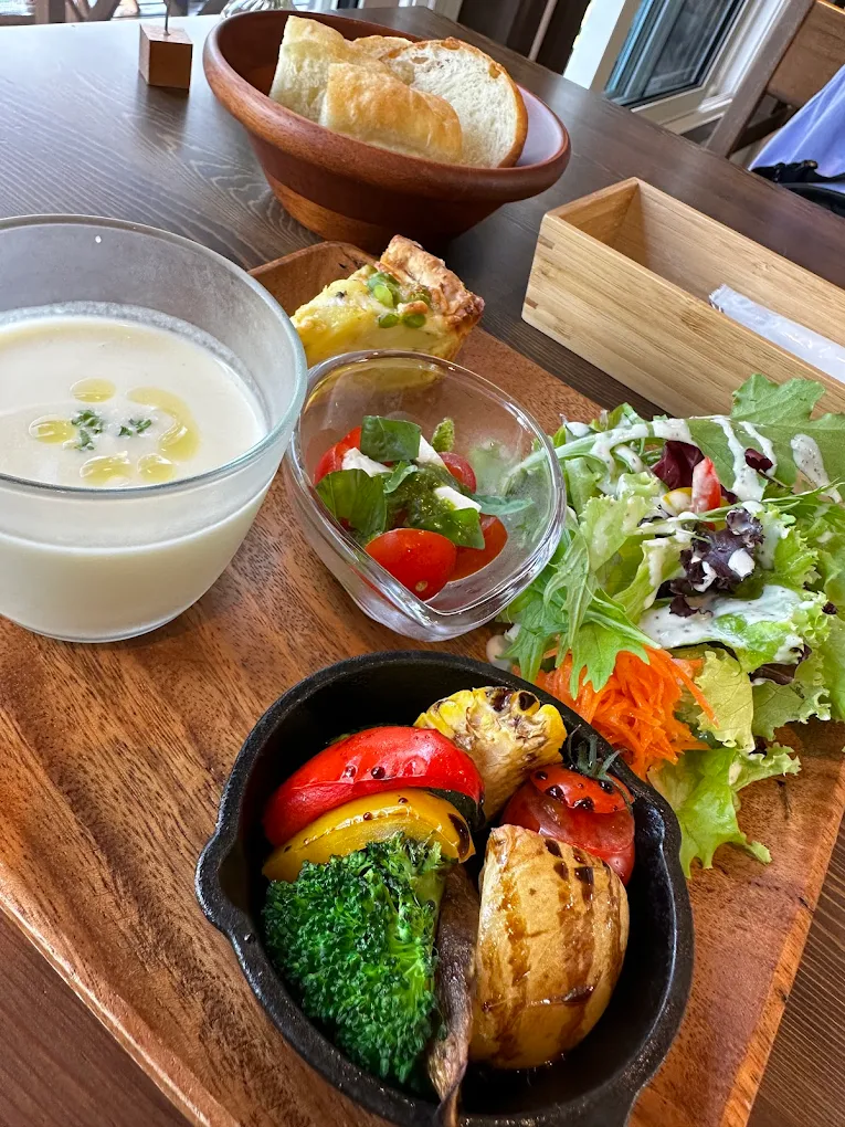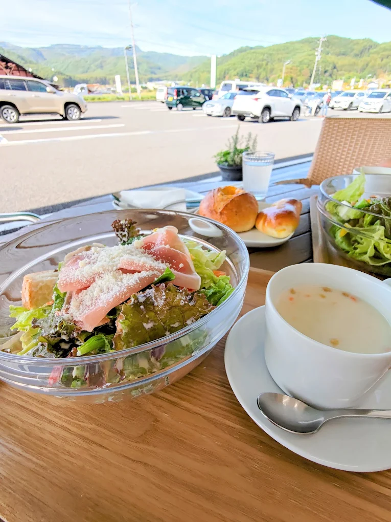 ビーナスライン沿いにある「たてしな自由農園茅野店」に併設されたカフェ&ベーカリー。関東甲信越地方最大級の売場面積を誇る直売所で新鮮な高原野菜を購入したあとに立ち寄れる便利なロケーションです。隣接する直売所から届く採れたての高原野菜をふんだんに使用した「自然の恵みたっぷりサラダ」が看板メニュー。