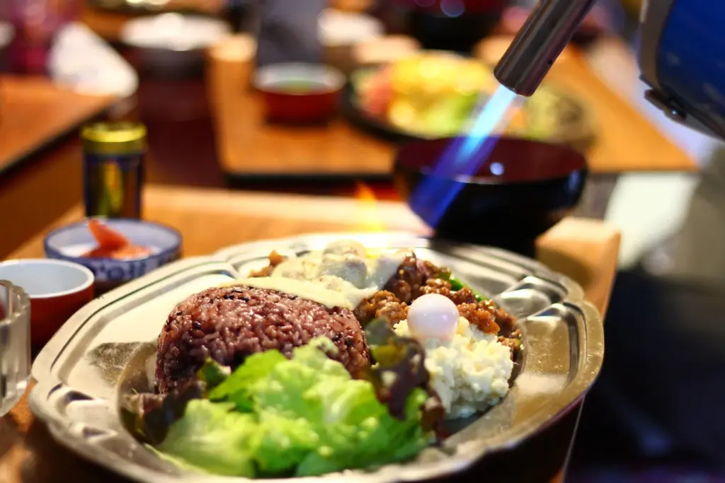 信州で生まれ育った牛豚肉を使い、日本の伝統食材を使った独自製法でふわふわと柔らかく濃厚なハンバーグを実現。秘伝の和風玉ねぎソースや、長野県塩尻のワインを使用したソースが自慢です。